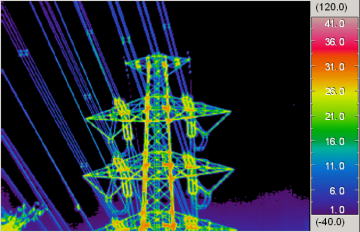 - 下の写真の送電鉄塔を、100m離れた地点から、標準の赤外カメラ(補助レンズなし)と、2倍望遠レンズ付および10倍望遠レンズ付の赤外カメラで測定したときの、熱画像を比較しました。